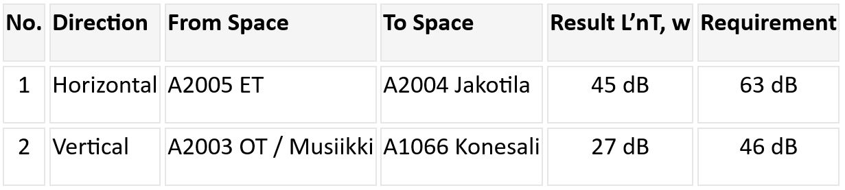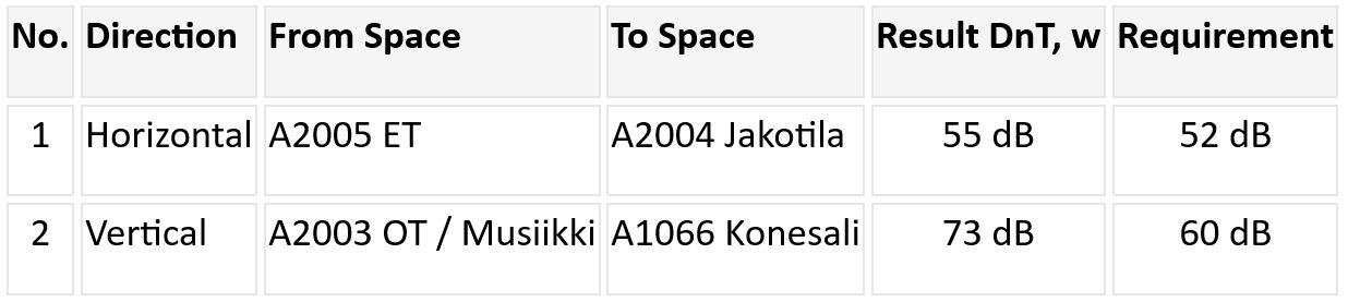 Measurements were performed using a loudspeaker connected to a pink noise generator. Sound pressure levels were recorded in both transmitting and receiving rooms, and standardized sound level differences (DnT) were calculated based on reverberation times. Both results horizontal for the wall structure and vertical for the floor exceed the requirements.